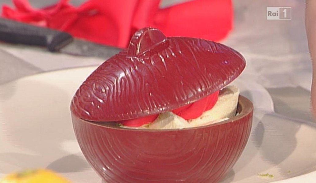 Per preparare la ricetta de La Prova del Cuoco, ecco intanto gli ingredienti che occorrono: per il cuore d’ananas- 65 g di zucchero, 55 g di burro di cacao, 250 g di polpa di ananas, 150 g di tuorli,5 g di gelatina. Per il biscotto: 90 g di albume, 30 g di zucchero, 50 g di tuorli, 95 g di zucchero,65 g di farina di mandorle, 65 g di farina di pistacchio, 30 g di burro morbido. Per fare il biscotto mettiamo in una ciotola lo zucchero con i tuorli e, mentre lavoriamo, aggiungiamo la farina di mandorle e pistacchio, gli albumi montati e il burro (fuso). Così inforniamo il tutto per 15 minuti mettendo in una teglia. Per la crema unite insieme: Ananas, tuorli, zucchero, gelatina e il burro di cacao. Versate tutto in alcuni stampini a forma di cuore e poi in frigo per tre ore. Con dei stampini fate i scrigni e disponete dentro i cuori.