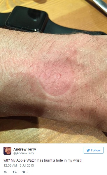 Diversi possessori di Apple Watch hanno diffuso su twitter le immagini dei danni (arrossamenti, irritazioni, segni di bruciature) dovuti all’indossare per tutto il giorno il nuovo orologio Apple. Inoltre Andrew Terry ha dichiarato, sempre su i social network, che il suo nuovo dispositivo gli ha creato un buco nel polso.